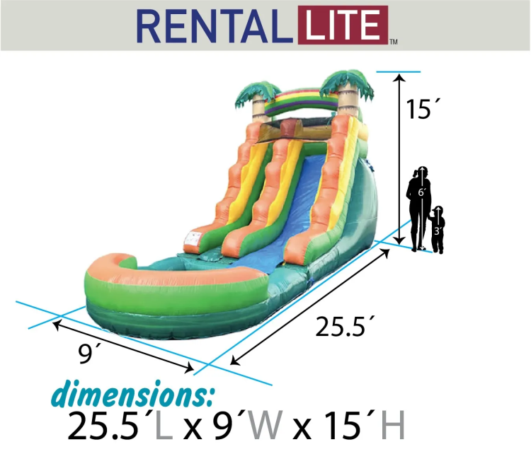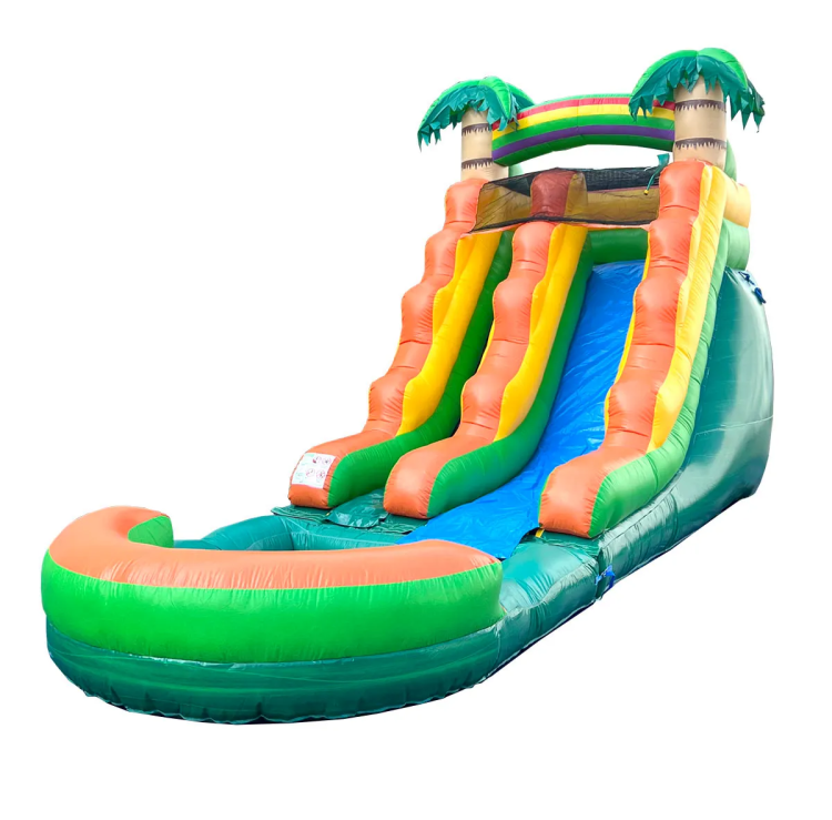 This vibrant tropical-themed inflatable water slide is perfect for backyard parties and summer events! Featuring bright green, orange, and yellow colors with palm trees and a rainbow arch at the top, it brings a fun island vibe to any celebration. Riders climb up the center and slide down the refreshing blue water lane into the splash pool at the bottom. Great for kids and teens, this eye-catching slide adds excitement and cool fun to birthdays, school events, and family gatherings.